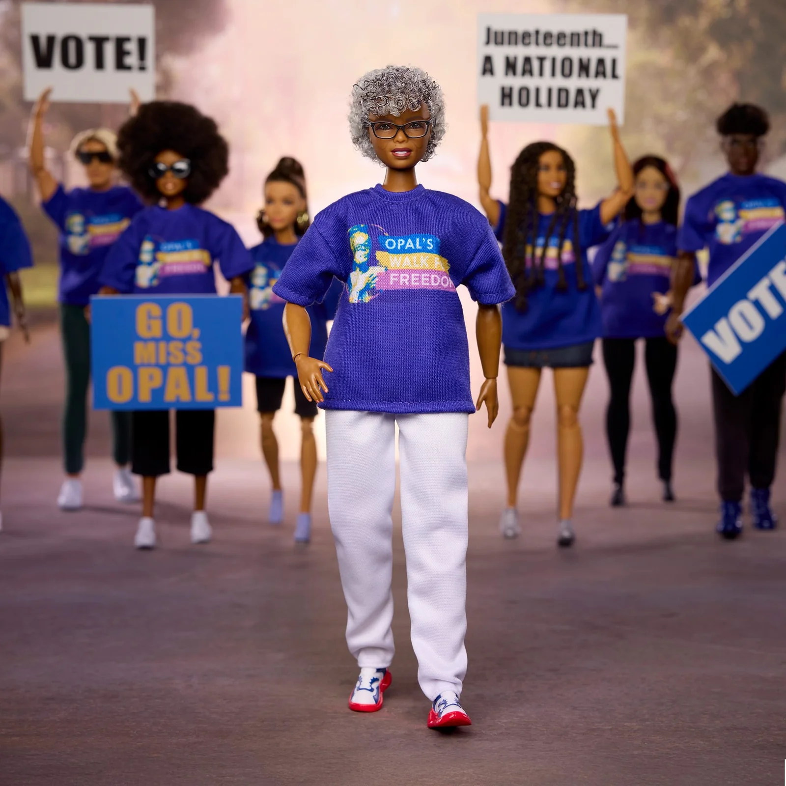 No que diz respeito ao corpo, a escolha foi por um modelo articulado, o que é um ponto positivo para quem gosta de dinamismo na estante (eu gosto de corpo estático, mas não daria pra colocar ela num Model Muse né? rs). A Opal Lee vem de tênis, uma referência direta à sua caminhada histórica aos 89 anos, o que justifica os flat feet. A simplicidade da camiseta "Opal’s Walk For Freedom" e da calça branca não busca opulência, mas precisão histórica. E funciona (pra mim).
